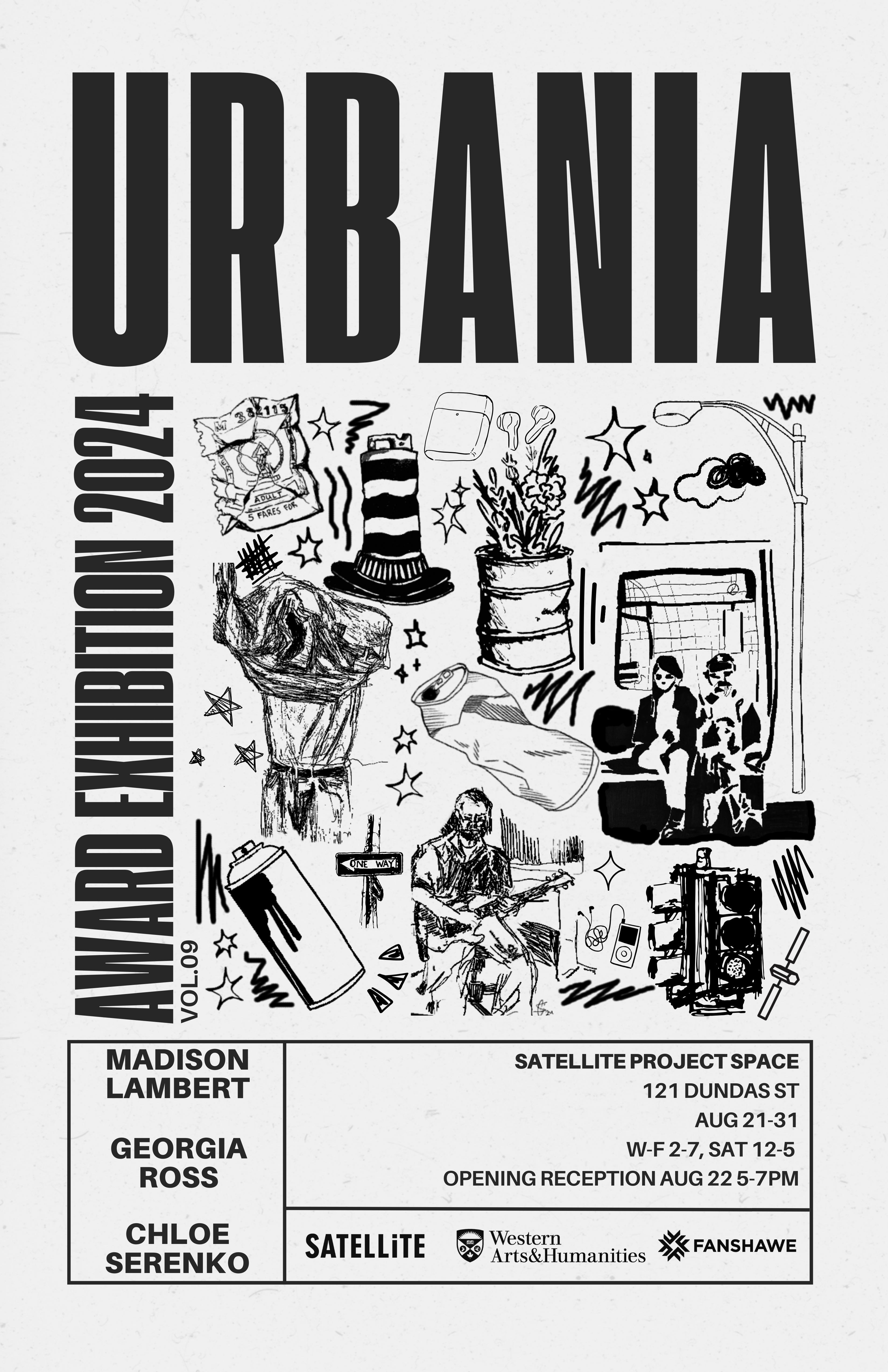 Satellite Project Space is pleased to announce the 2024 Award Exhibition, with three featured emerging artists, Madison Lambert (Bealart), Georgia Ross (Fanshawe College, Fine Arts), and Chloe Serenko (Western University BFA). Each year these academic institutions offer the opportunity for graduating students with a growing practice time to explore their artistic practices with depth and display their recent projects in a culminating group exhibition. Each artist has their own unique approach to exploring art making, and has a viewpoint to share about their current environment and societal experiences. They have each grown up in their own communities and have witnessed and undergone events that have constructed their approach to life. Specifically referencing urban life and modern relationships with partners, their communities, and the city environment, “Urbania” provides a look into the perspective of Lambert, Ross, and Serenko as they expand their artistic practices at pivotal moments in their careers.