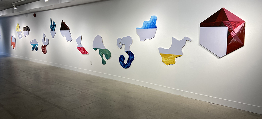 A wall installation of 40’ holds fragments of individually-shaped acrylic panel paintings contributing to an illusion of a purple-grey toned rectangle. While the geometric illusion is formed from fragments, the other half of the shaped painting/object contains individually chosen and painted subjects.