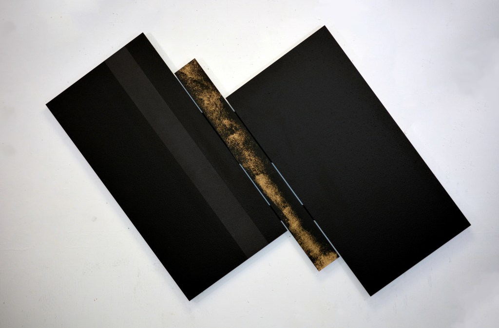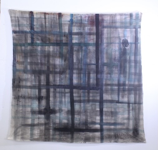 Elizabeth Merzib enjoys how the use of unstretched raw canvas gives her abstract paintings an understated and soft strength. Her monochromatic works communicate a sense of motion and rhythm through the gestural application of watered-down acrylic paint and charcoal in long repetitive strokes. Elizabeth’s work carries a dark and mysterious aestheticI that can draw a viewer deeply into the piece.