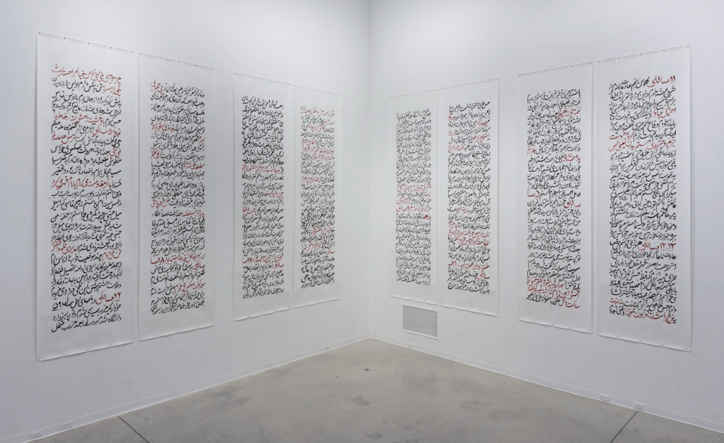 There is a temporary but obvious obstacle to most viewers when first entering the space: the language barrier. The majority of those who view this piece likely do not speak Persian, much less regularly read Persian calligraphy enough to understand what is written on these scrolls. Hashemi, however, has a remedy for this. Tucked away in a small, rectangular alcove to the right of the space is a small coffee table surrounded by cushions. Laid upon the coffee table are three booklets, within them being direct English and French translations of the calligraphy written on the scrolls. It was upon reading the 30 page translation that I truly learned how impactful this work was. The auto-ethnography is raw and unfiltered. Its contents are graphic, but not for the sake of the viewer’s shock or discomfort. It is documentation of gender-based violence and abuse in its purest form: a first-hand account spanning decades of Zahra’s life.