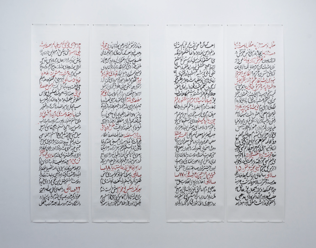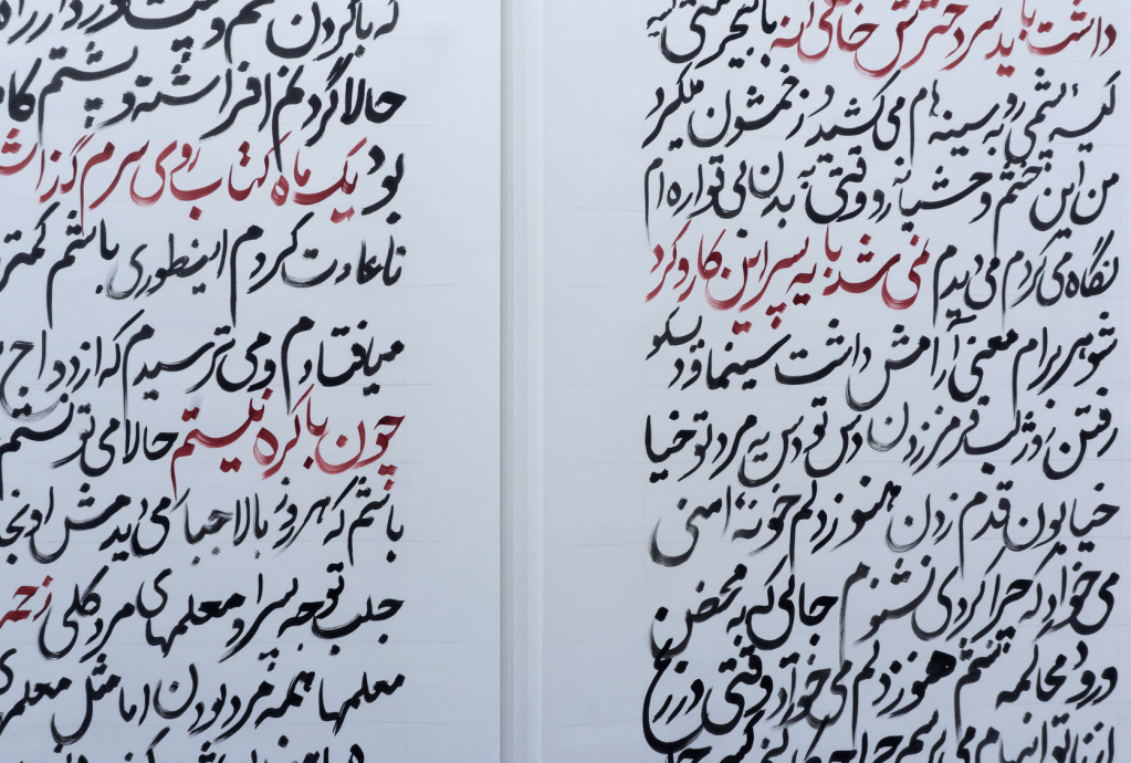 When the viewer enters the gallery in which Grounding: States of Gender (2026) is presented, they are immediately immersed in the space. Hung on the walls are 22 massive scrolls that almost span floor to ceiling in height and are decorated in red and black Persian calligraphy. What is written in this calligraphy is a direct reproduction of an autoethnography written by a woman named Zahra. The small portions of red calligraphy are excerpts from the text that impacted Gita most upon her reading of it. There are only a few excerpts on each massive scroll that are this brilliant shade of red, making them stand out when compared to the rest of the calligraphy that is written in black ink. A large video is projected onto the floor in the centre of the exhibition space. This video plays on loop, and documents the first three days of the aforementioned initial creation of Grounding. The video plays at 2x the normal speed and displays Gita meticulously painting the calligraphy of the first six scrolls.