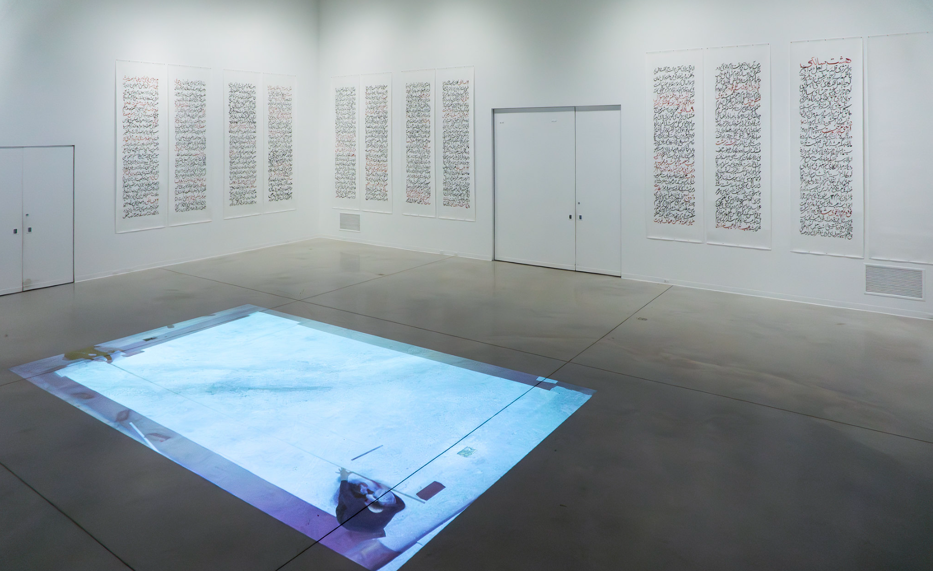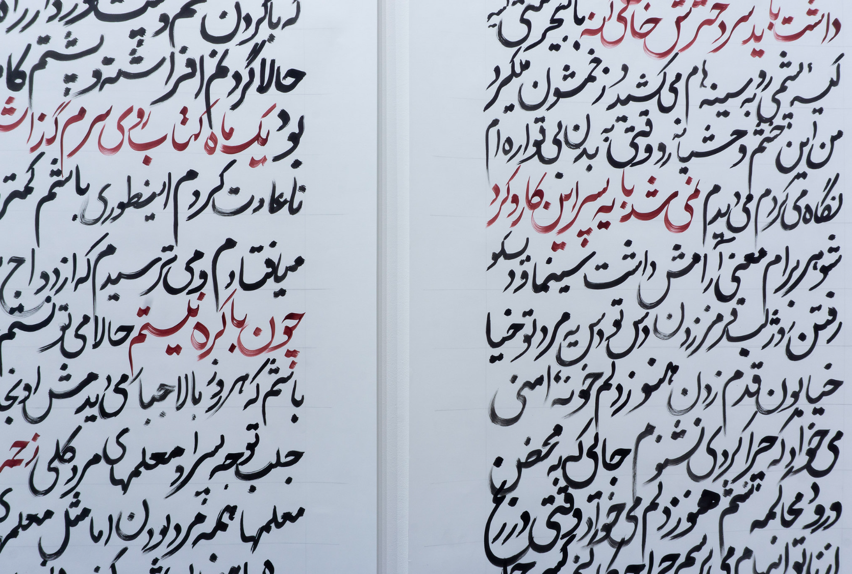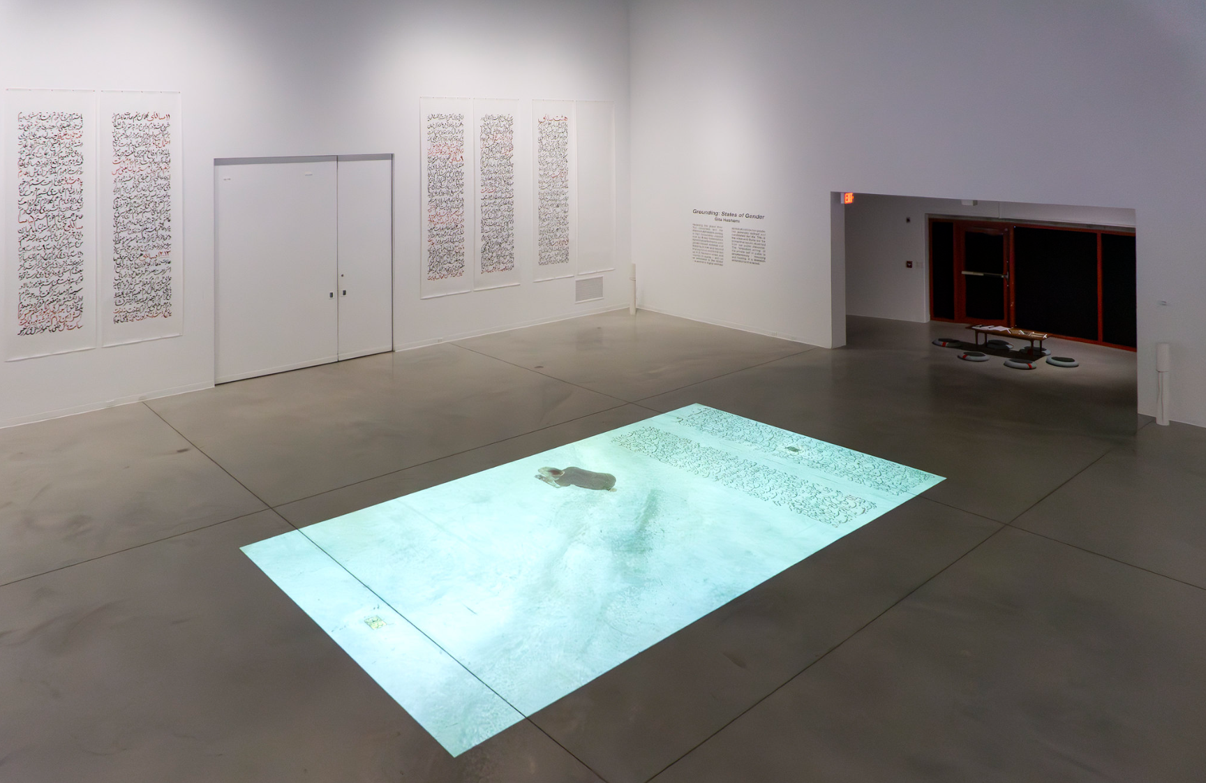 When the viewer enters the gallery in which Grounding: States of Gender (2026) is presented, they are immediately immersed in the space. Hung on the walls are 22 massive scrolls that almost span floor to ceiling in height and are decorated in red and black Persian calligraphy. What is written in this calligraphy is a direct reproduction of an autoethnography written by a woman named Zahra. The small portions of red calligraphy are excerpts from the text that impacted Gita most upon her reading of it. There are only a few excerpts on each massive scroll that are this brilliant shade of red, making them stand out when compared to the rest of the calligraphy that is written in black ink. A large video is projected onto the floor in the centre of the exhibition space. This video plays on loop, and documents the first three days of the aforementioned initial creation of Grounding. The video plays at 2x the normal speed and displays Gita meticulously painting the calligraphy of the first six scrolls.