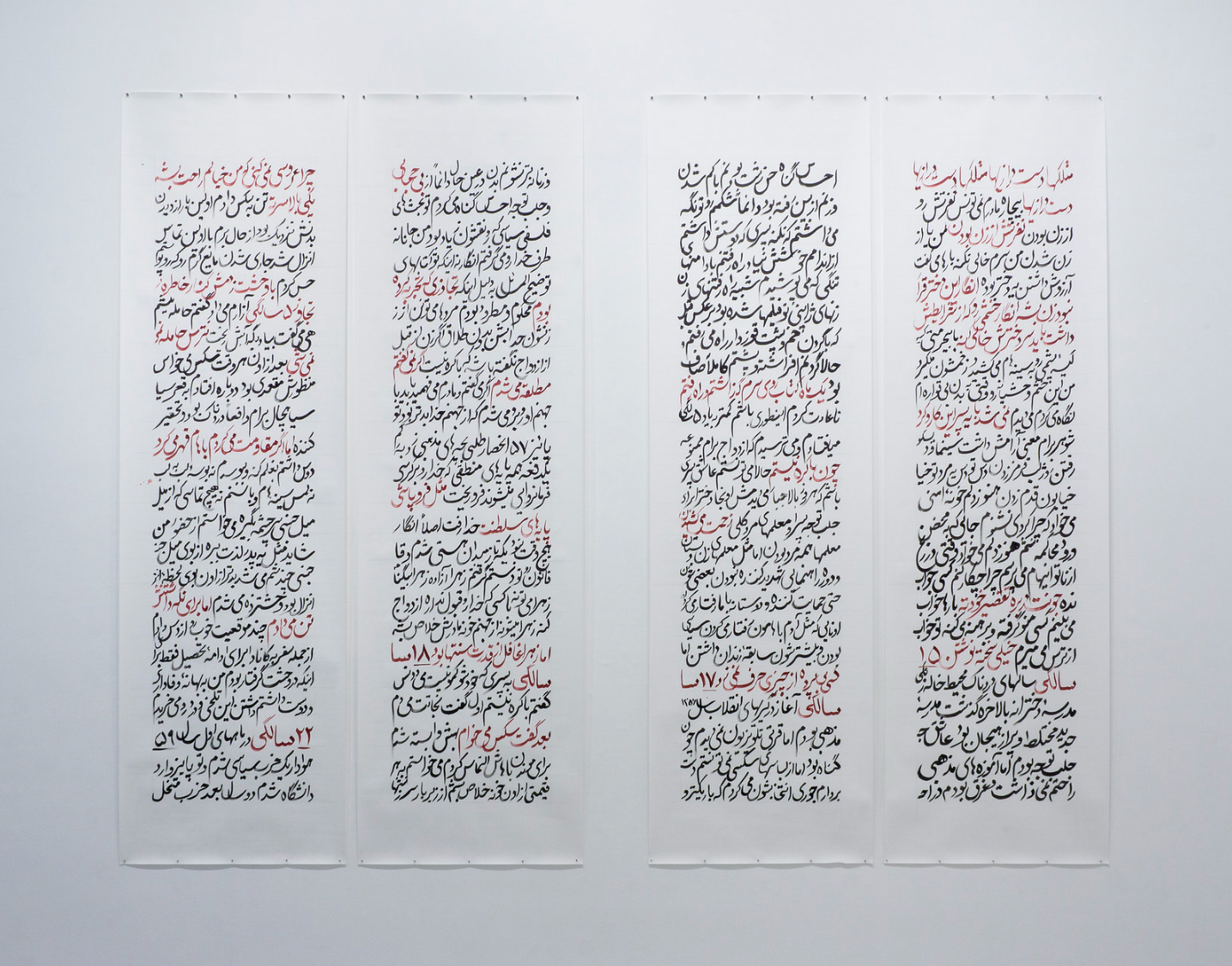 There is a temporary but obvious obstacle to most viewers when first entering the space: the language barrier. The majority of those who view this piece likely do not speak Persian, much less regularly read Persian calligraphy enough to understand what is written on these scrolls. Hashemi, however, has a remedy for this. Tucked away in a small, rectangular alcove to the right of the space is a small coffee table surrounded by cushions. Laid upon the coffee table are three booklets, within them being direct English and French translations of the calligraphy written on the scrolls. It was upon reading the 30 page translation that I truly learned how impactful this work was. The auto-ethnography is raw and unfiltered. Its contents are graphic, but not for the sake of the viewer’s shock or discomfort. It is documentation of gender-based violence and abuse in its purest form: a first-hand account spanning decades of Zahra’s life.