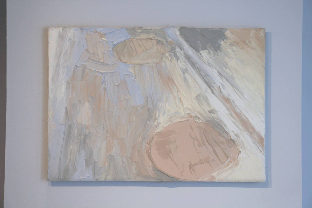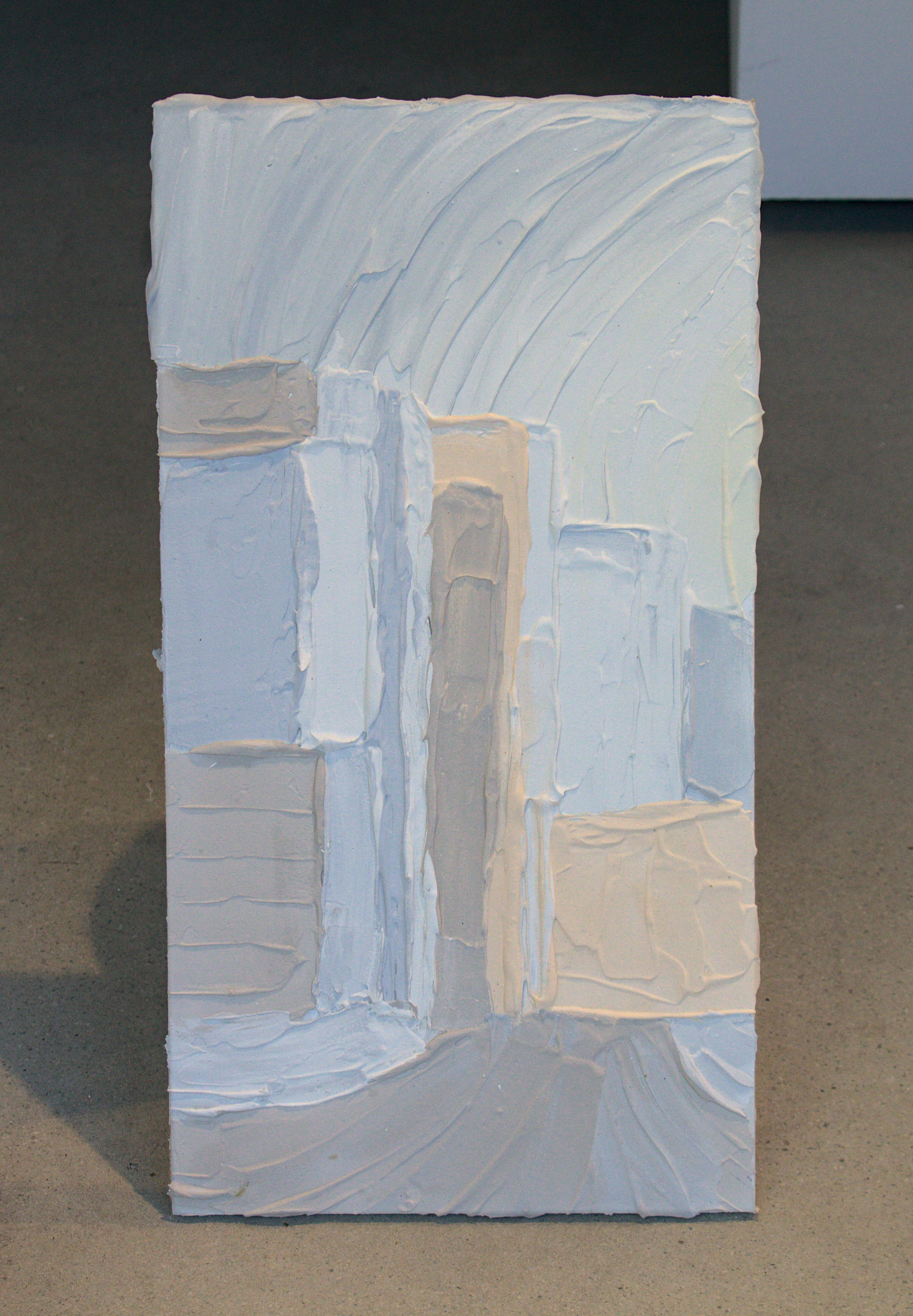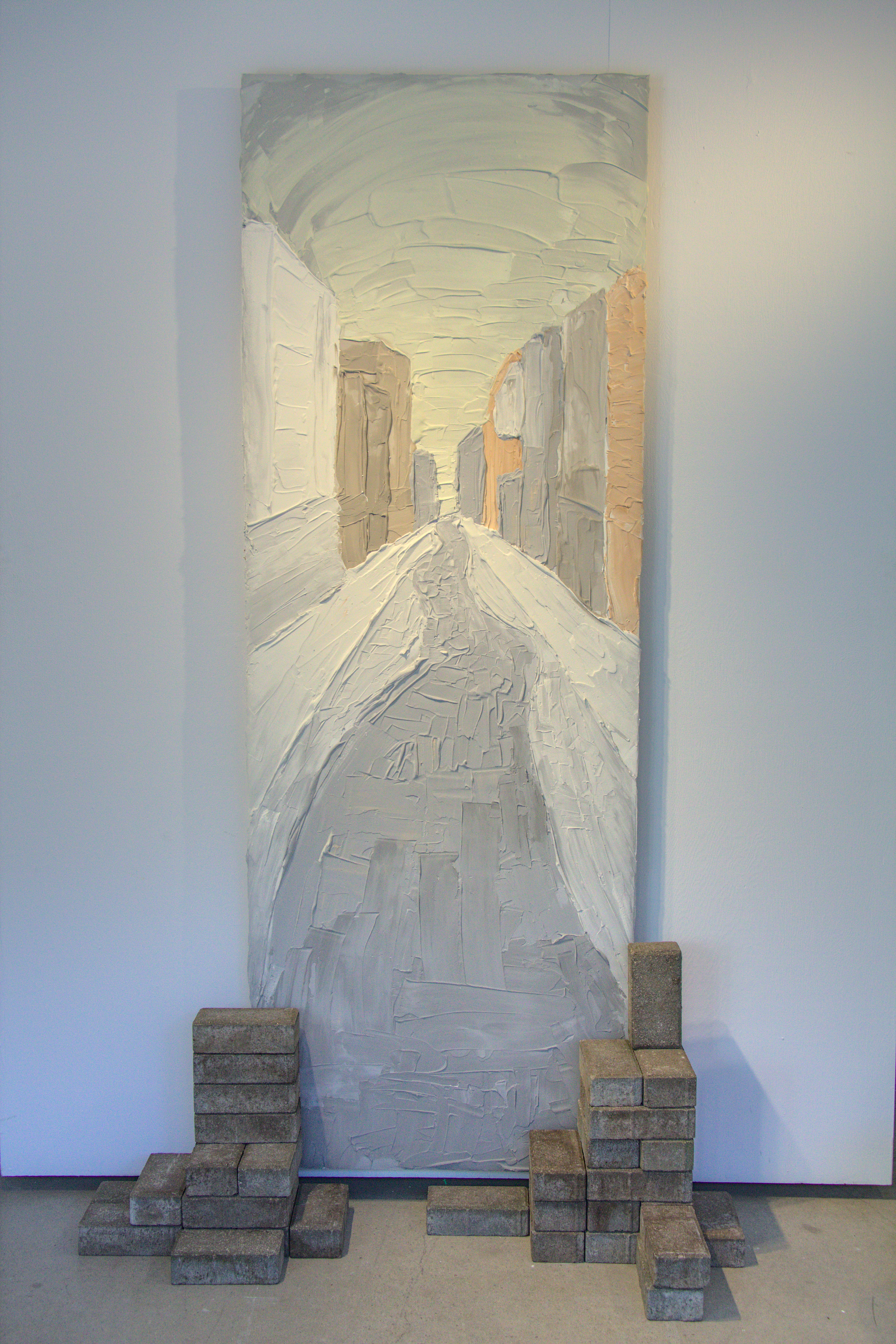 Each work is made up of compound on drywall, materials often found in construction. The compound is a viscous liquid as it is applied, but hardens to a solid over time. This creates a push and pull sensation within the works; the fluid appearance, contrasted by its solid state. To exemplify this, each piece contains geometric shapes inspired by views seen in London, Ontario. The works view the passage of time without sadness or joy, but simply as observers of the dynamic world.