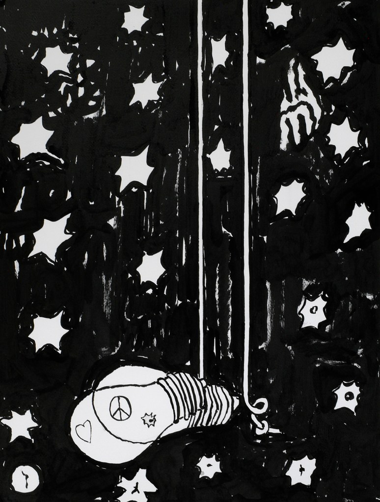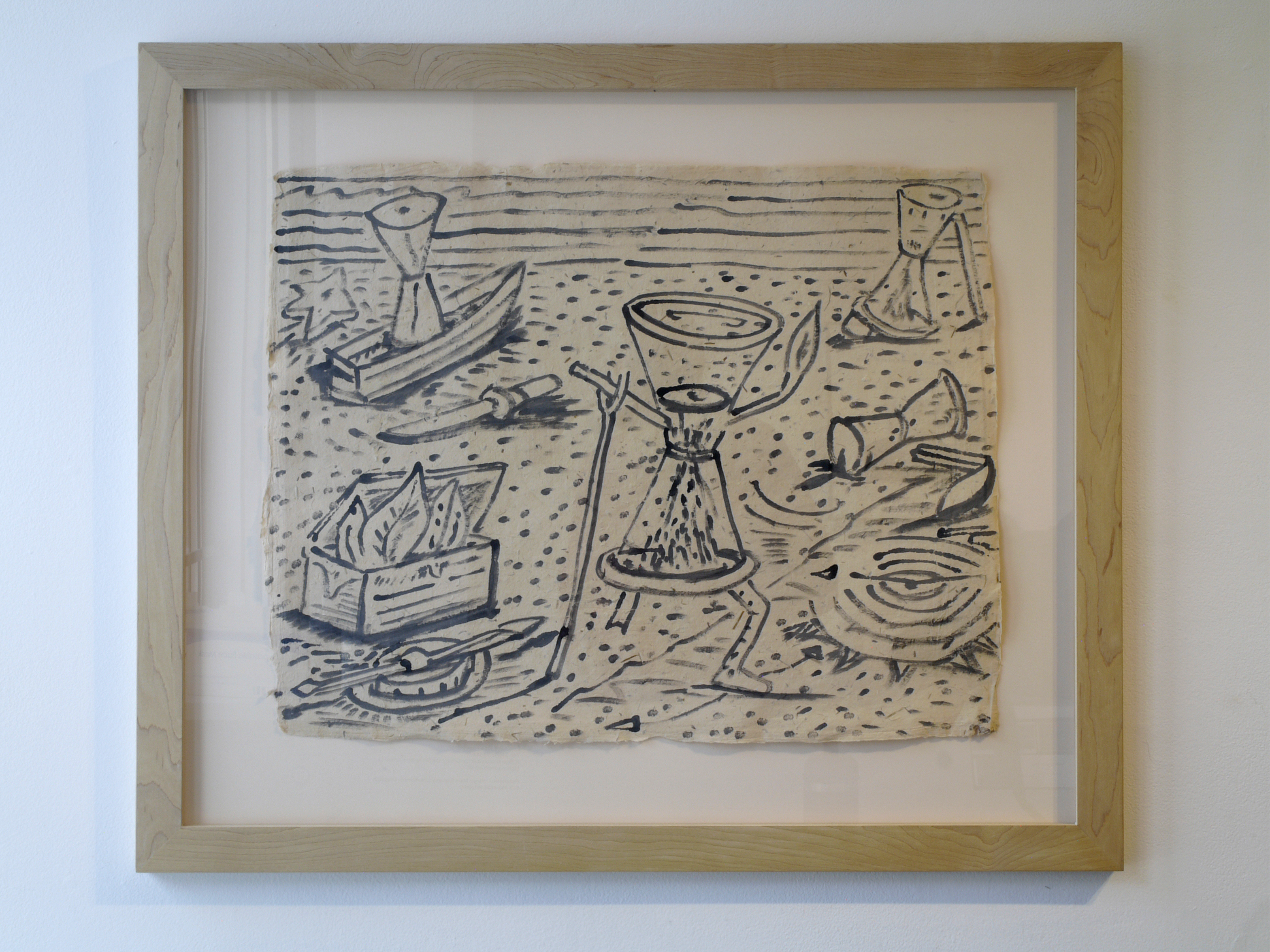 Kim Moodie frequently works in ink, using a process called “automatism.” He buys numerous sheets of the same paper and considers the weight, scale and ink absorption as part of his methodology. He has a large toy collection and often uses and adapts them as a basis for images in his drawings. He sometimes uses stencils, but the majority of his drawings are made free style, allying mind and hand.