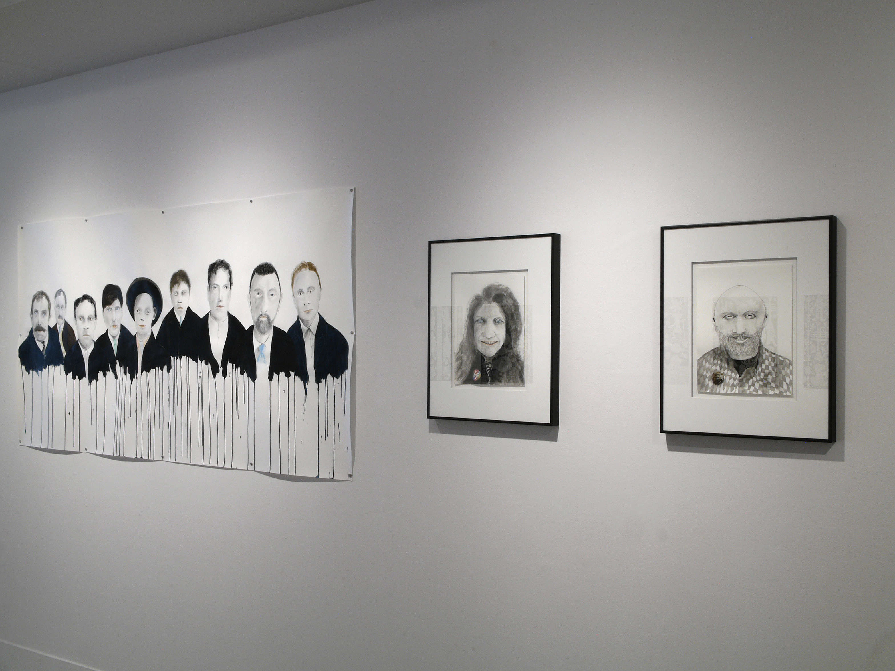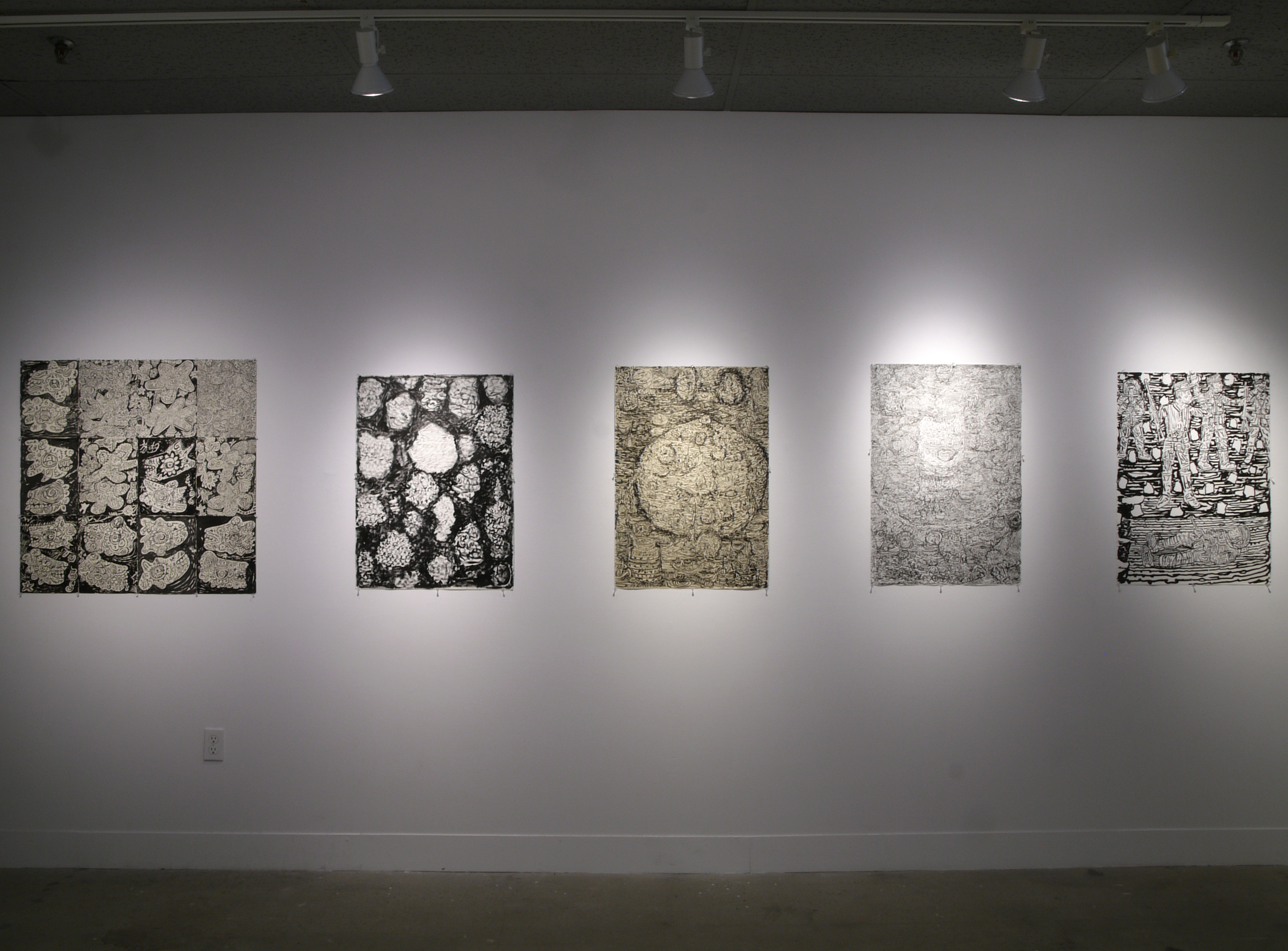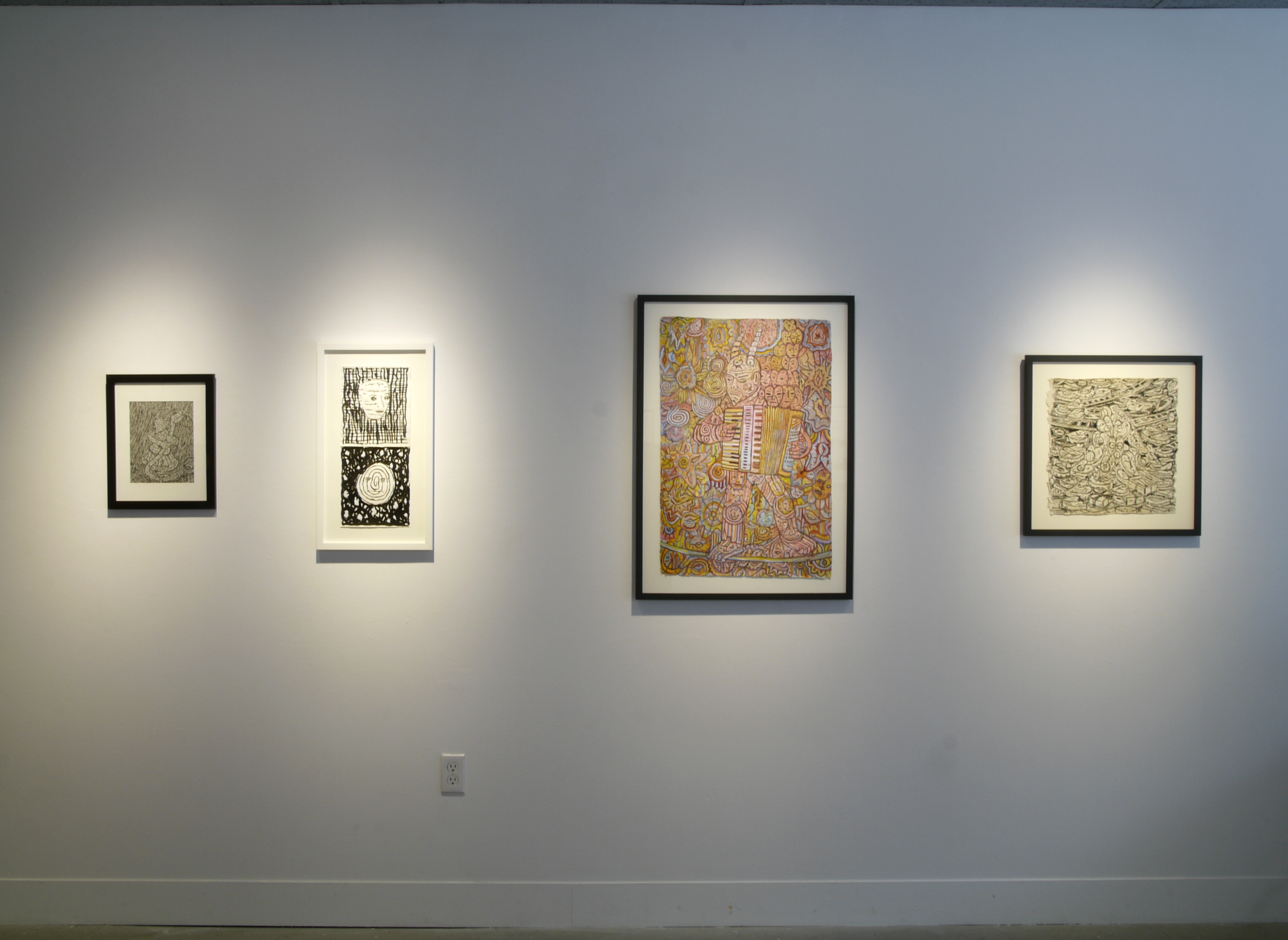 Wyn Geleynse’s first two loves were drawing and photo based image making which he pursued for many years ignoring drawing, except for idea notations. In 2009 he purchased a 100’ foot roll of cheap white bond paper that he installed in his studio like a window blind with the intent to start drawing again using dollar store brushes and India ink. His drawings in this show mostly date from 2019, ten years after that start.
