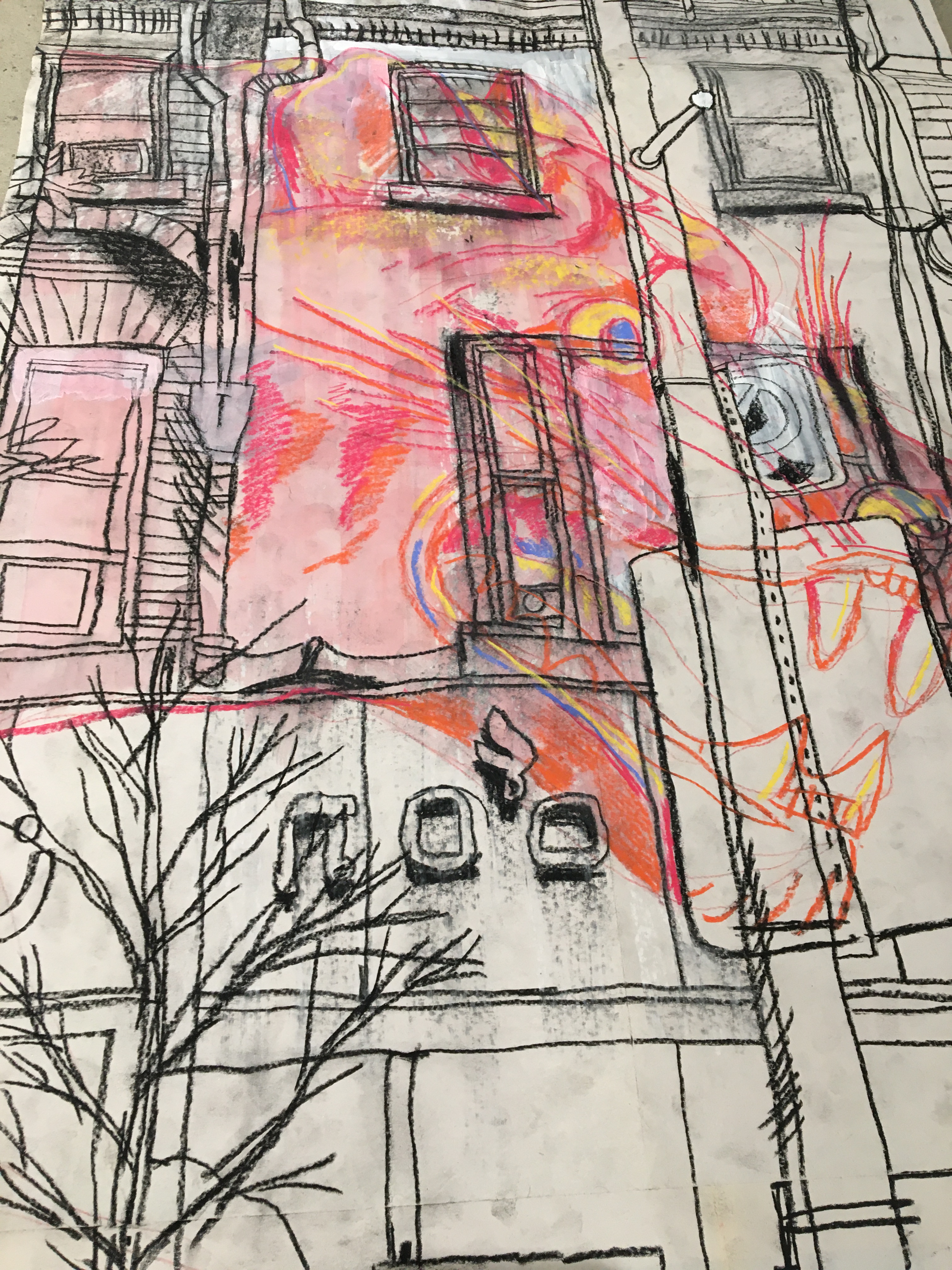 ‘It’s a jungle out there!’ is a window installation by Ian Indiano. The installation puts hope and uncertainty together. In each one of the three panels, the other side of Dundas Street is reflected, as if seen from inside the gallery. A character looks at the window, but we don’t know if he’s trying to get a peek of what’s inside or staring at the outside world. The character is scared, but curious. He knows that the world he’s watching is wild and unpredictable, but seductive and promising.