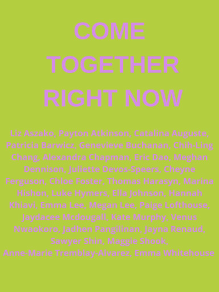 The students of the first year Advanced Visual Arts Foundation Course at Western University are pleased to present their exhibition at Satellite Project Space, Come Together Right Now.