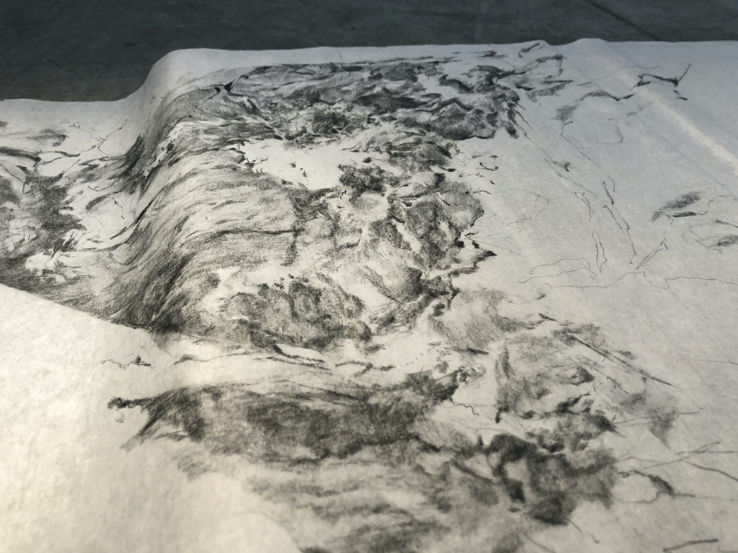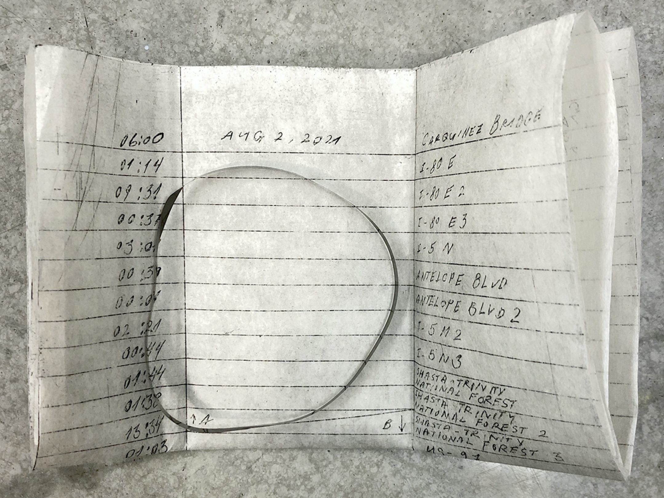 Masha Kouznetsova records her immediate environment and transitions between places using pinhole photography, mark-making, found and handmade objects, and audio tapes. Through these recording processes, she explores her relationship to migration, time, place and no-placeness, distance, and wayfinding. hard ground / long road is an installation of sound, sculpture, and works on paper that are based on the sound recordings from the artist’s drive between San Francisco, California and London, Ontario August 2-19, 2021. During the seventeen days on the road, Masha Kouznetsova recorded radio noise (AM, FM picket-fencing) as well as her voice describing the environment surrounding the road at the times when she could not stop to take a photo.