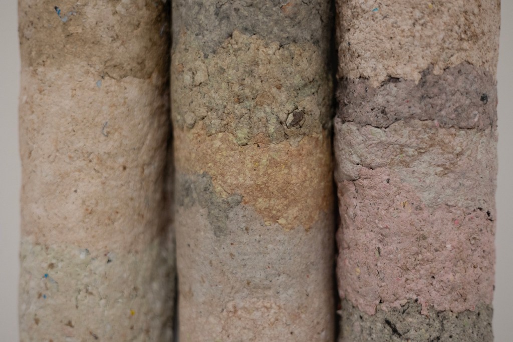 6 x 6 x 36 inches. Recycled paper pulp, found pigment, sizing, and wire