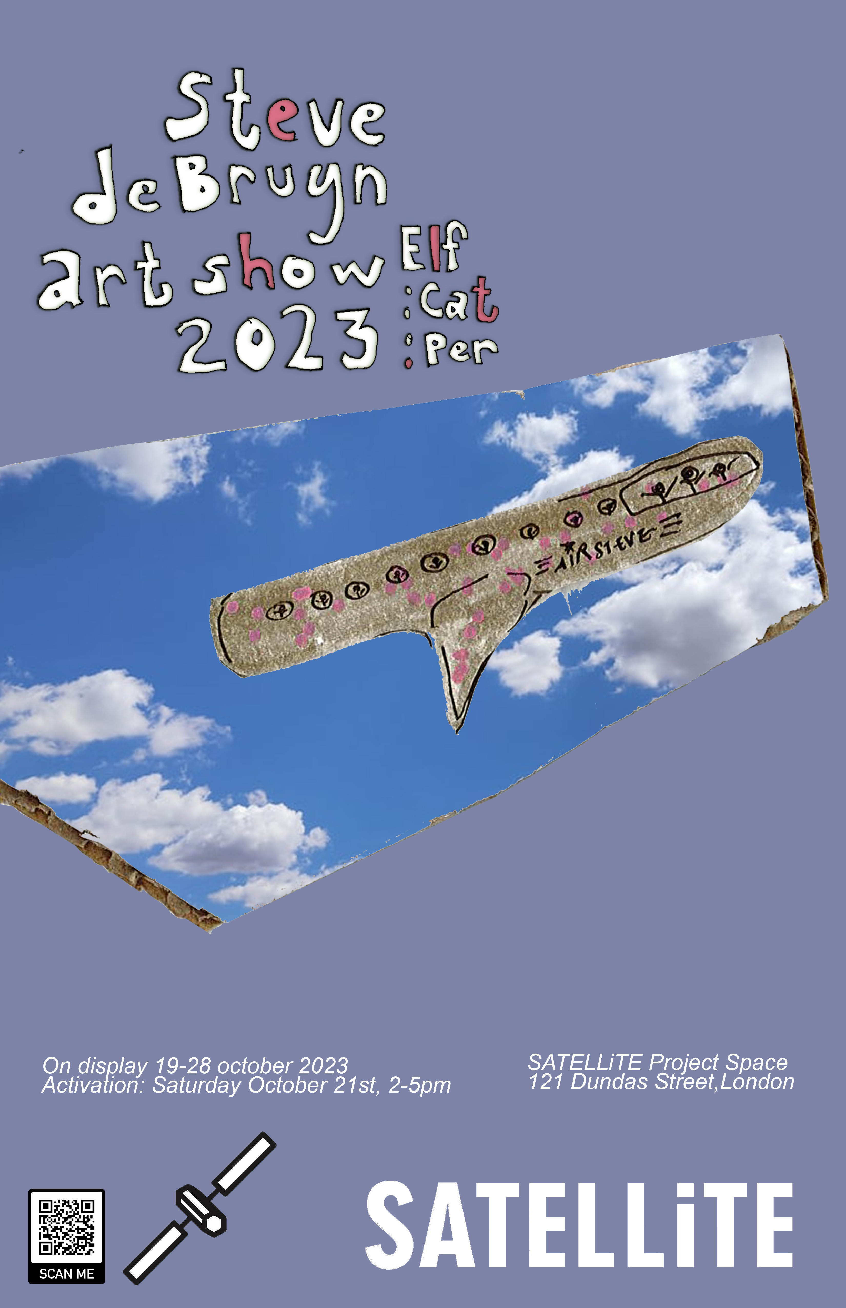 Steve deBruyn Art show 2023:Elf:Cat:Per is an art show that was made to be seen! It is an art show that is made to be experienced! A tour through the twisted turns of a reverted and pivoted methodology much in the throes of the ongoing process of art school, this exhibition dares to posit a direction in the future by besmirching the past. Old styles and ways of working are meant here to be judged and regarded once and for all only to be grudged and discarded in a most unceremonious manner. Pretty pictures in wood and paint lovingly cared for must make room for the more barbed constituents which make up the actual onus held aloft by the true revealers of what is what and who says why. We shall fly to the loftiest heights on Steve Airlines! Only to safely land back on Earth amongst lovely and vast piles of ruined tangents seen through massive holes in massive shoes when regarded from thirty thousand feet! Colour and revelry for all! Vistas will be seen, hills will be climbed only to be furtively descended again in bobs and weaves, roads will fork only to impale themselves on the very tangs that made them so interesting in the first place. But not to despair, this art show will come to a cozy conclusion that will envelop its unassuming visitors in the warmest of hugs. You. Are. Invited!